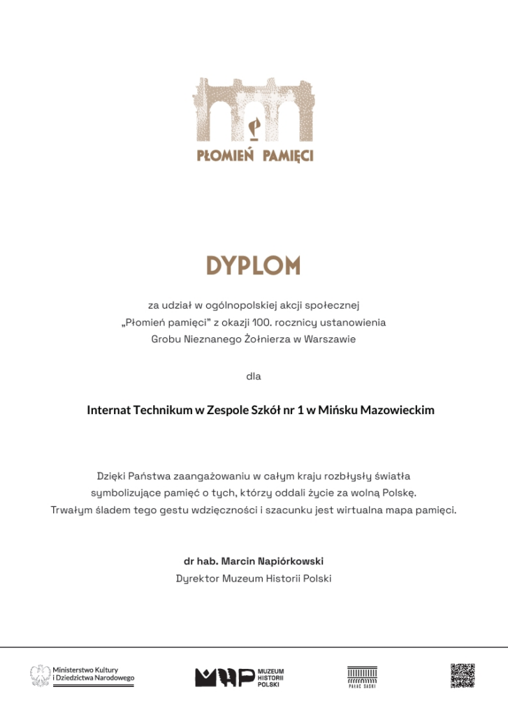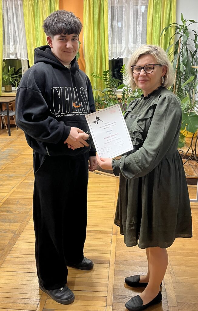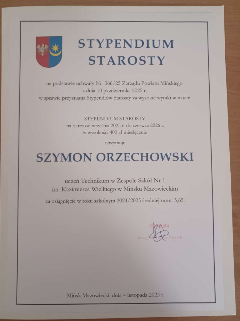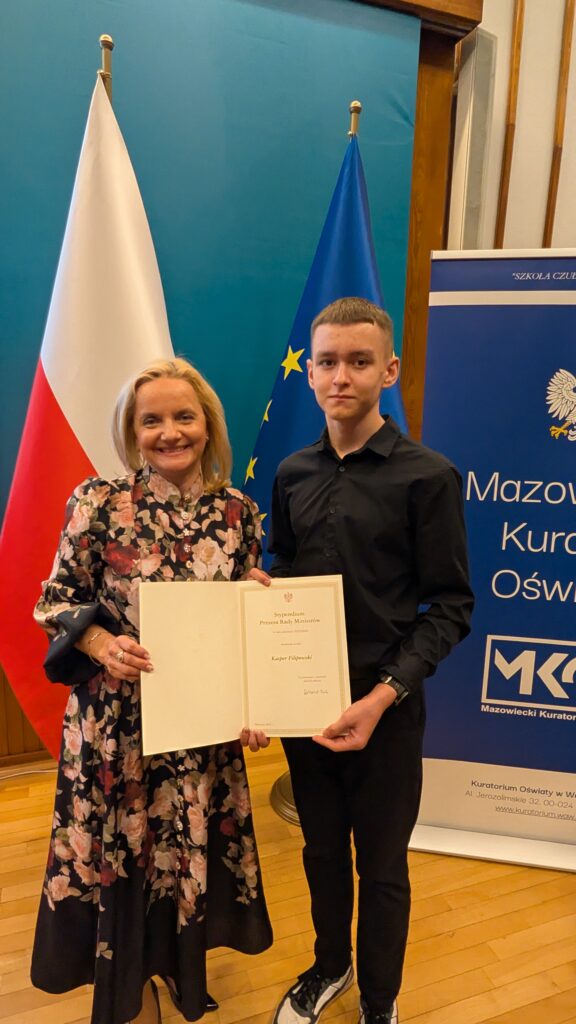 04.12- Z przyjemnością chcemy ogłosić, że nasz mieszkaniec Kacper Filipowski, uczeń klasy III PRO otrzymał z rąk Mazowieckiej Kurator Oświaty Stypendium Prezesa Rady Ministrów za najwyższe wyniki w nauce- średnią 6.0 i zachowanie wzorowe w Technikum Zespołu w roku szkolnym 2024/2025.