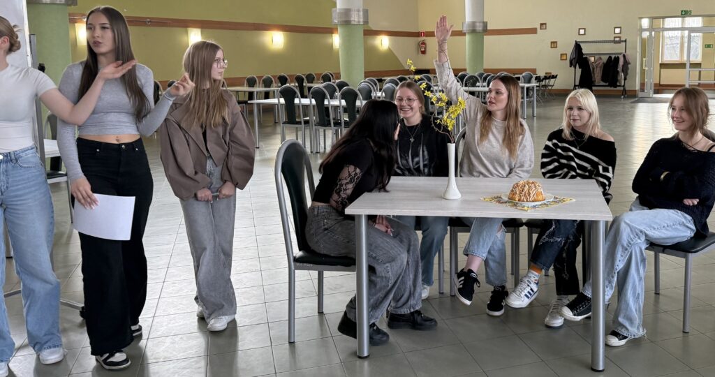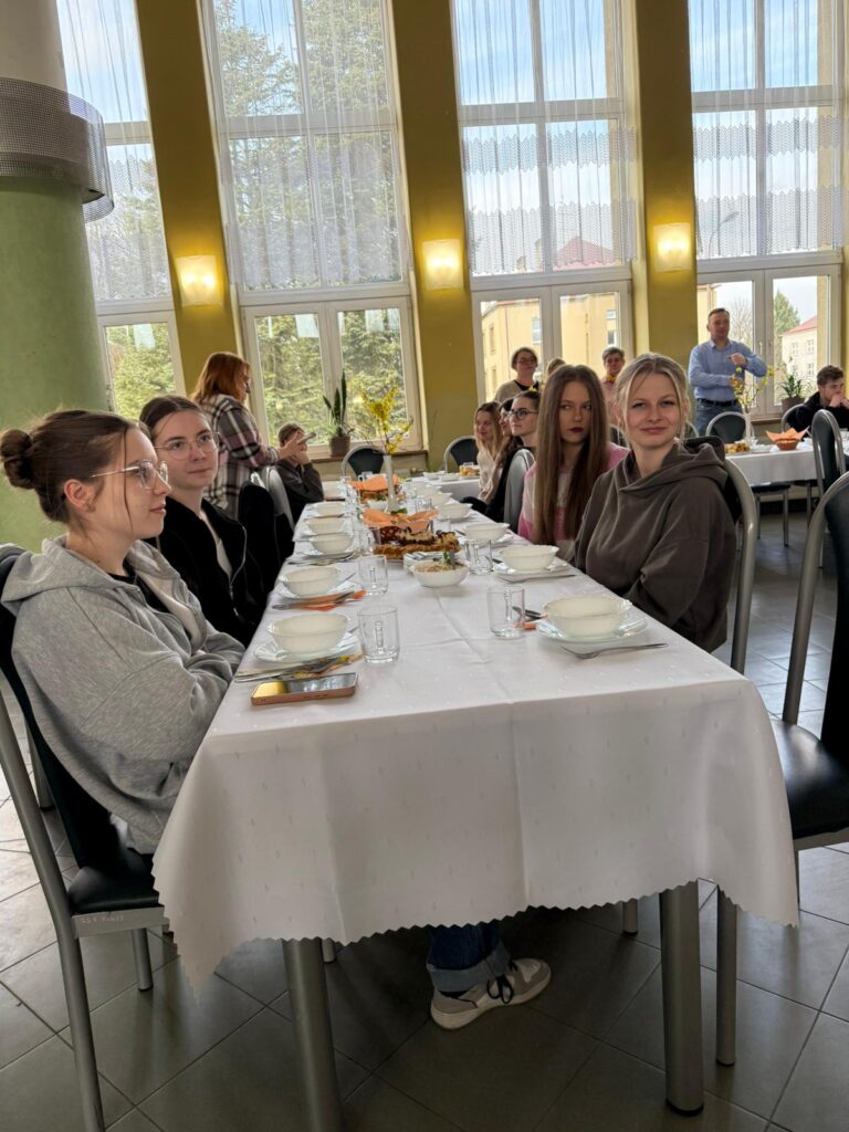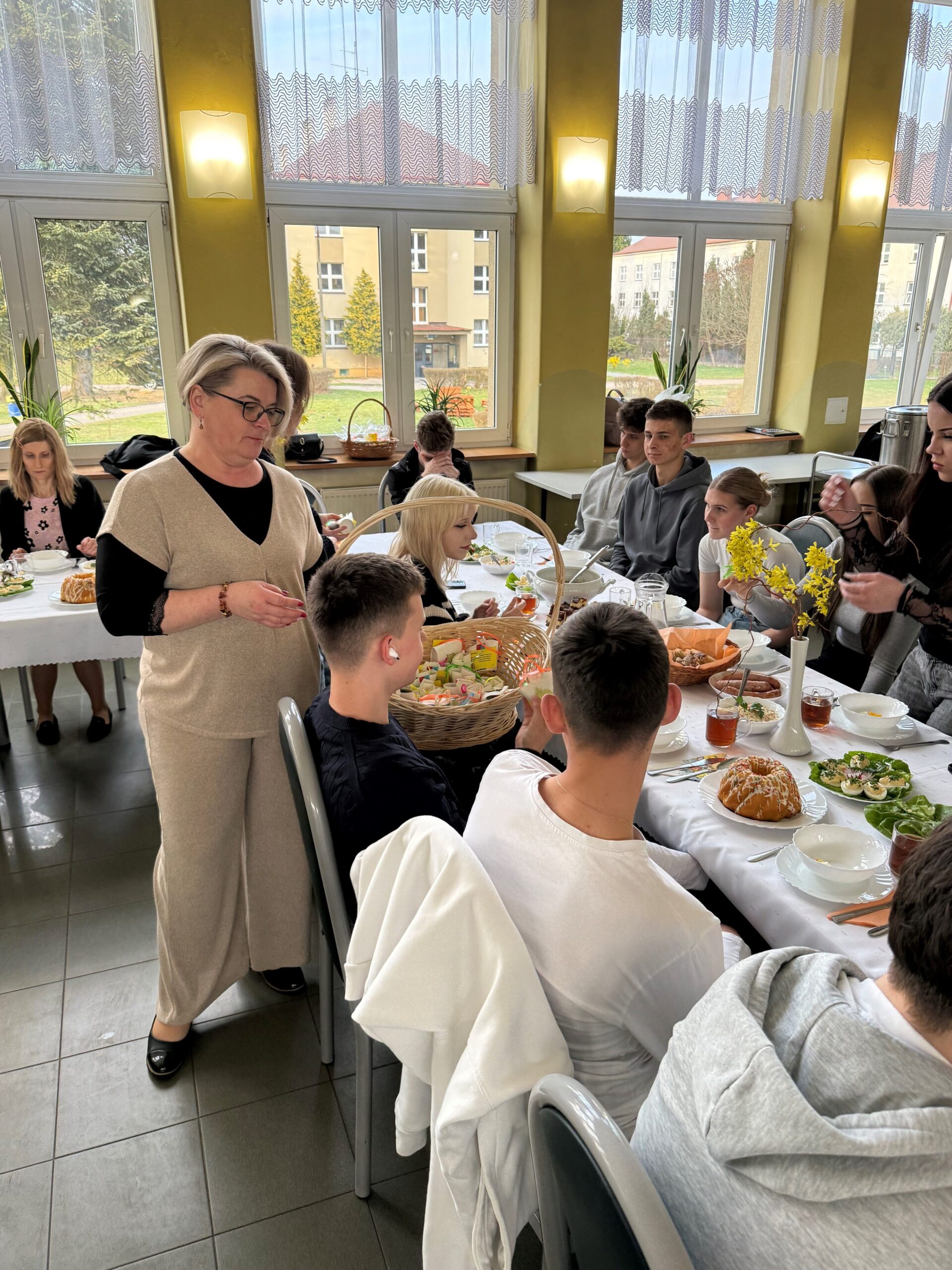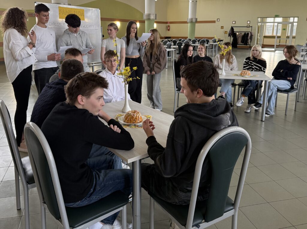 Kultywując nasze tradycje w świątecznej atmosferze odbyliśmy spotkanie wielkanocne. Na stołówce szkolnej rozegraliśmy okolicznościową familiadę, w której zwyciężyła grupa dziewcząt. Wszyscy biesiadowaliśmy przy świątecznym stole ze smacznymi potrawami i ciastami. Nawet otrzymaliśmy słodkości od króliczka wielkanocnego…